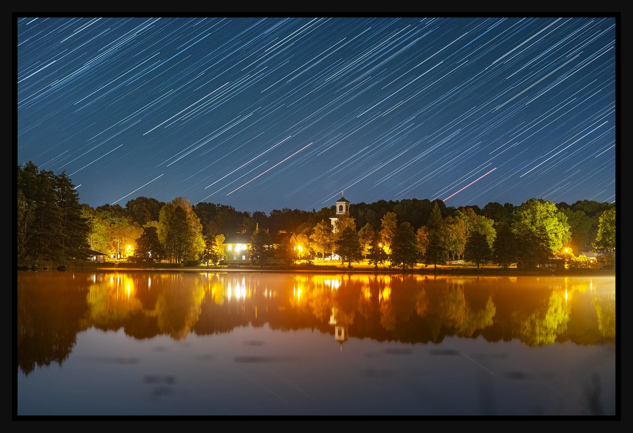 Roberts Kommentar: Bara några dagar efter jag tog bilden “Stjärnorna vaktar” var jag ute igen på en kall, stjärnklar natt för att hitta fler motiv. Den tidlösa, vackra kyrkan gömmer sig delvis bland träden, men kyrktornet ägnar sig åt att bli avbildad mot stjärnhimlen. Bilden i sig är mycket fin, men saknar det där lilla extra - något som fick mig att tänka på Tomas!